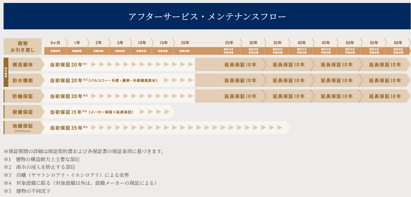 構造躯体保証と防水機能保証は10年に1度、白蟻防除に関しては5年に1度のペースでの有償メンテナンスを行うのがベストです。